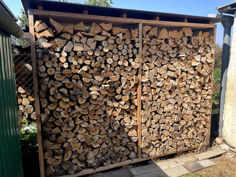 Dřevník zajišťuje dobré proudění vzduchu a ochranu před deštěm, takže sušení probíhá přirozeně a rychleji.