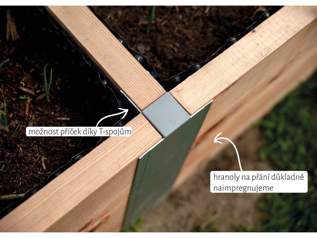 Díky speciálním profilům tvaru T, které nám umožňují spojit 3 fošny do pravého úhlu a tím vytvořit T-spoj, můžeme tvořit záhony o nekonečné délce. Přepážky mají nejen estetickou funkci, ale slouží i jako přiznané vzpěry, které zabraňují vyboulení dlouhých stěn. Náš konfigurátor je velikostně omezen, ale pokud chcete jiný tvar, pošlete nám poptávku a my se vám v nejkratším možném termínu ozveme.