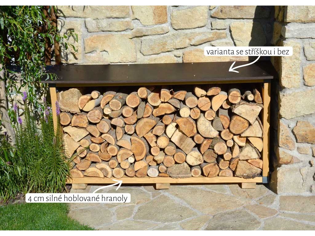 - střecha z voděodolné překližky včetně spojovacího materiálu - přesah střechy děláme standardně o 15 cm více než je hloubka dřevníku, případně napište vlastní požadavek do poznámky v objednávce