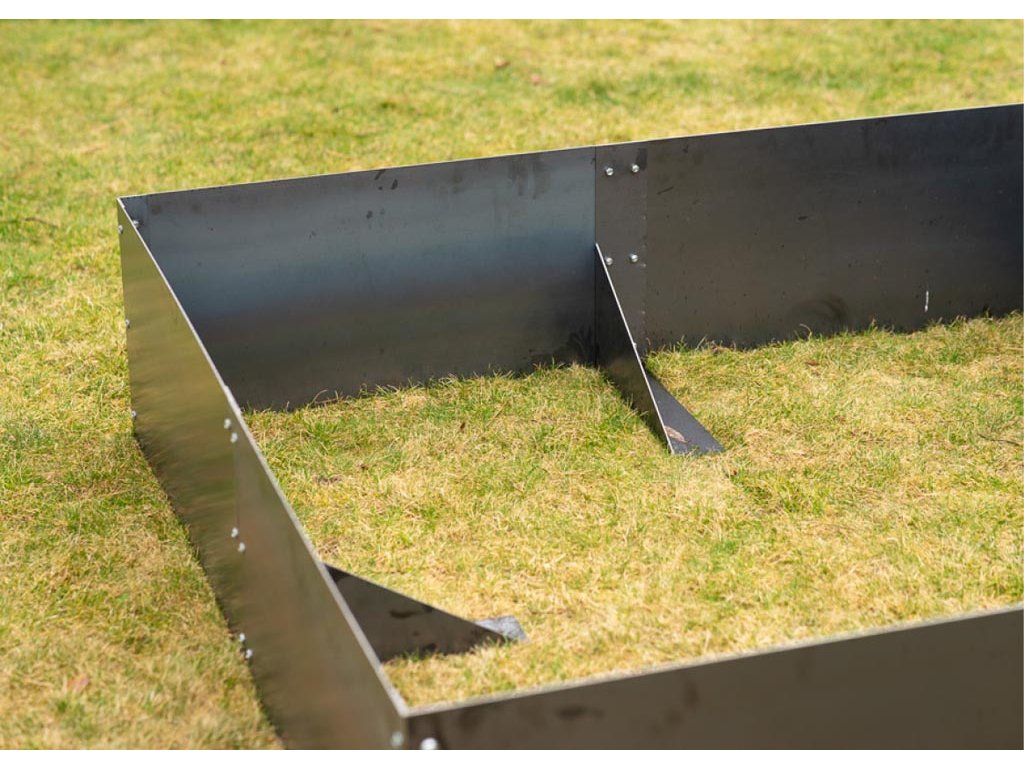 Záhon je bez dna, což umožňuje přímý kontakt s půdou, přirozené odvodnění a zdravý růst kořenů. Robustní konstrukce se šesti bočnicemi, horním dvojitým ohybem, středovou výztuhou a 12 kotvícími kolíky zaručuje maximální stabilitu i při výsadbě větších rostlin.