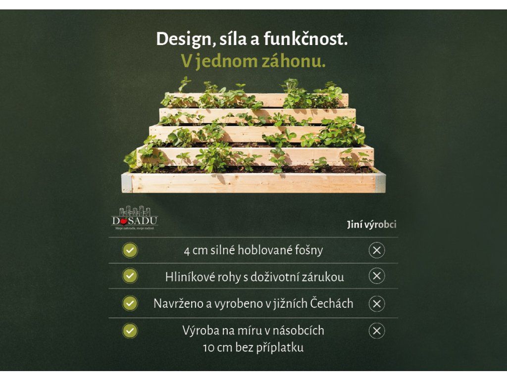 Půdorysné rozměry: šířka 150, 175 nebo 200 cm. 3 patra každé 30 cm čistá vnitřní hloubka, celková hloubka záhonu je 106 cm.