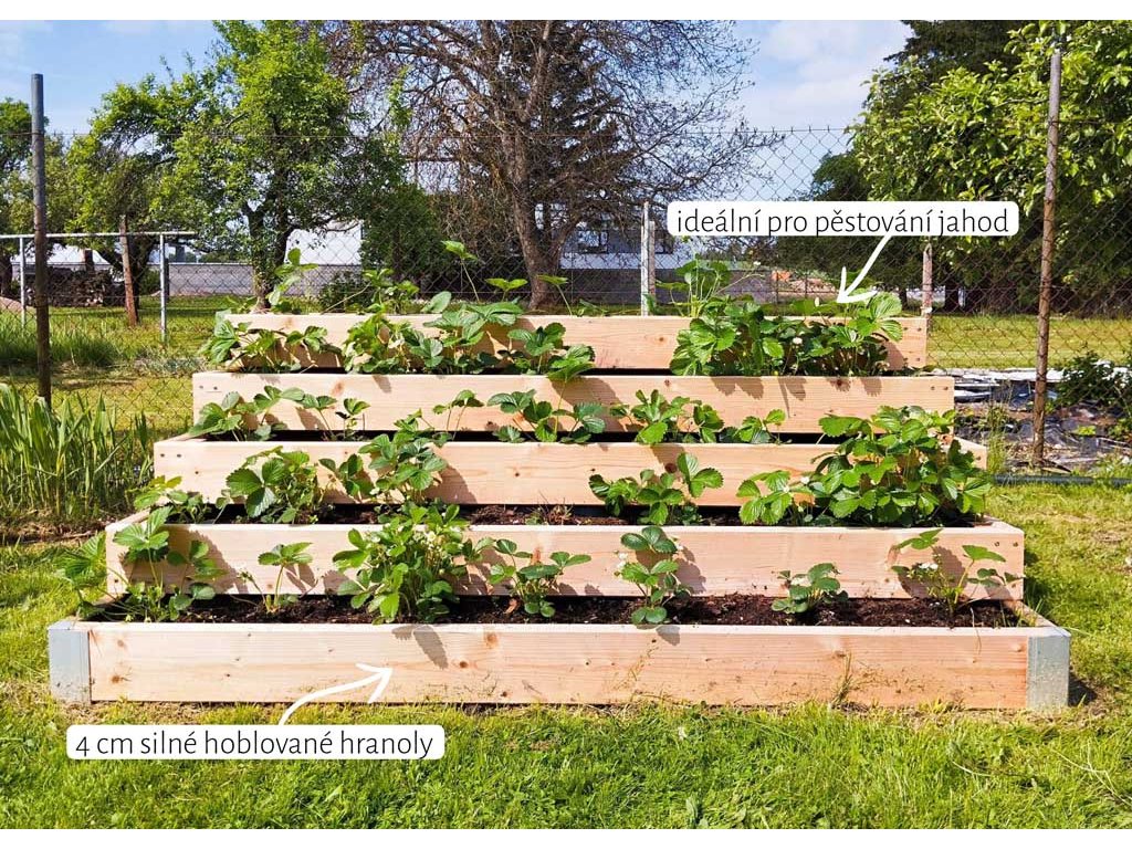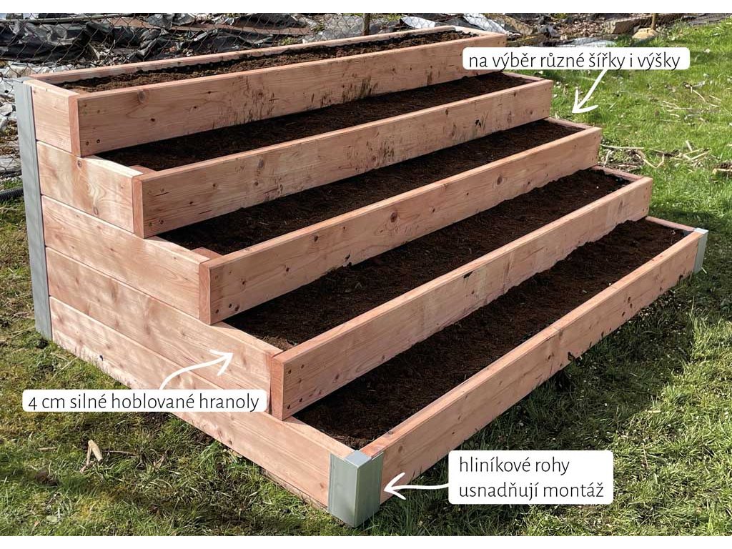 Půdorysné rozměry: šířka 150, 175 nebo 200 cm. 5 pater každé 30 cm čistá vnitřní hloubka, celková hloubka záhonu je 174 cm.