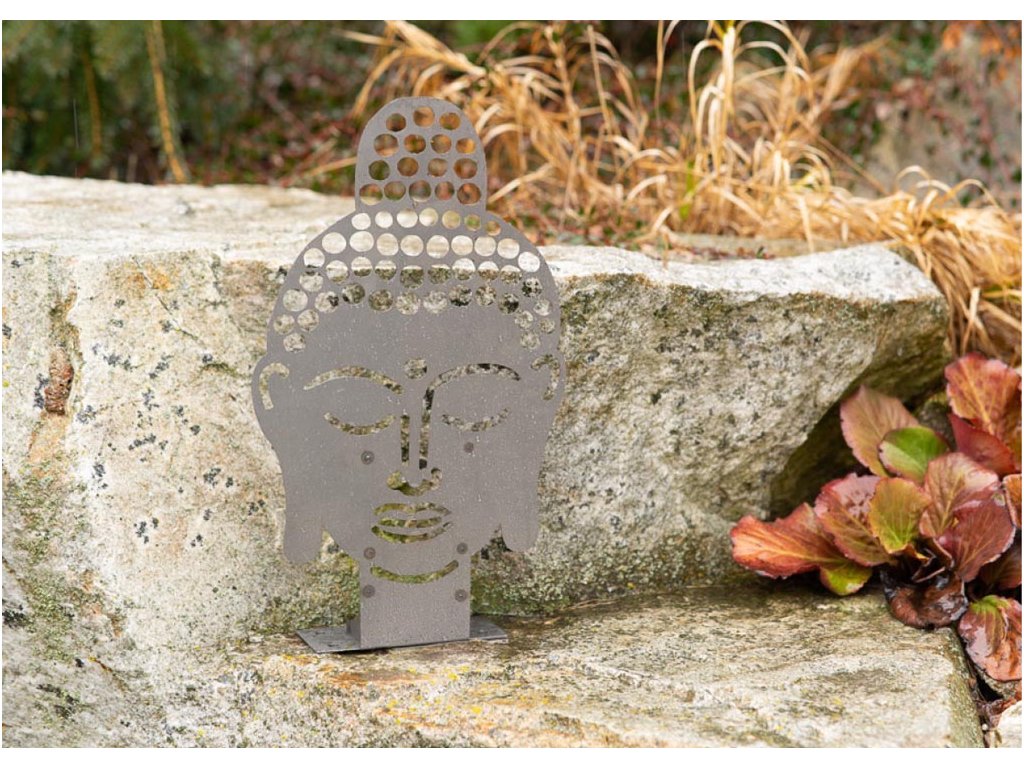 - cortenová hlava Buddhy s integrovaným stojánkem