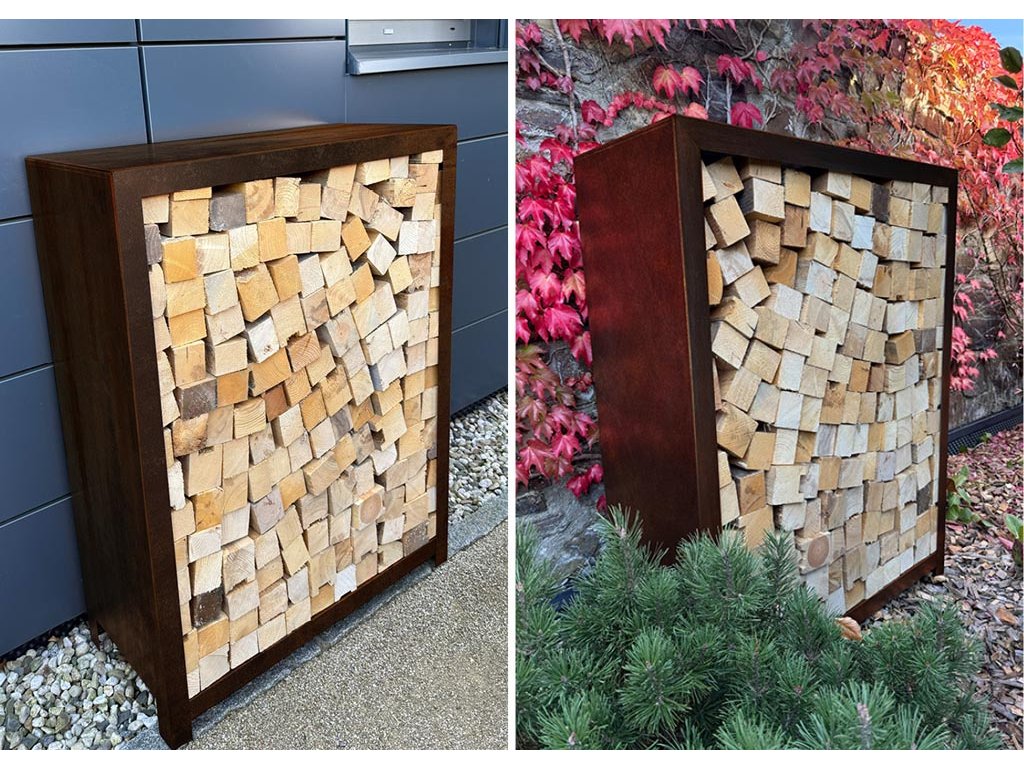 Dřevník z cortenu může fungovat jako samostatný solitérní prvek v zahradě, ale také jako součást větší architektonické kompozice. Skvěle ladí s dalšími cortenovými prvky, jako jsou záhony, truhlíky, ohniště nebo obrubníky, a podporuje jednotný styl moderní zahradní architektury. Jako skvělý doplněk zahrady se hodí i cortenová krmítka nebo dekorace.