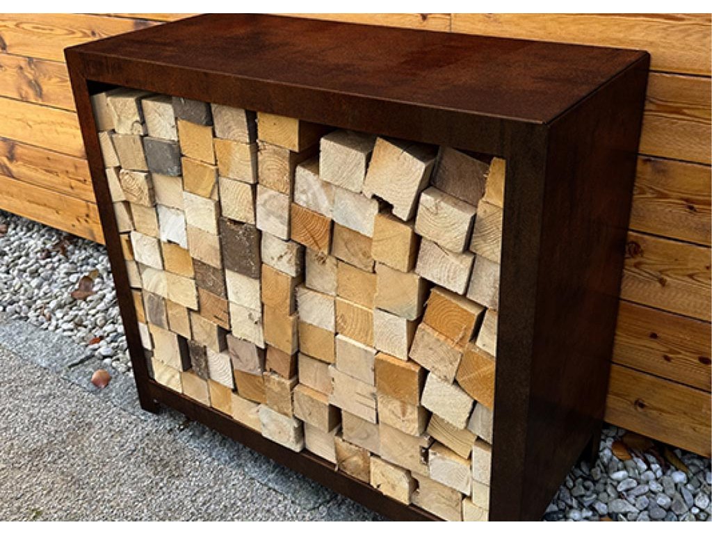 Použitá COR-TEN® ocel je materiál známý svou dlouhou životností a minimálními nároky na údržbu. V průběhu času se na jejím povrchu vytváří charakteristická rezavá patina, která chrání ocel před další korozí a dodává dřevníku jedinečný, přirozený vzhled. Každý kus je originál, jehož estetická hodnota s věkem roste.