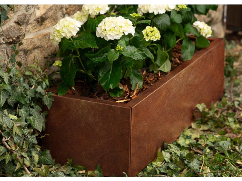 Zahradní květináč LINE je prémiový designový květináč obdélníkového půdorysu z cortenové oceli COR-TEN® a je výsledkem precizní české výroby. Tento materiál je ideální pro venkovní použití – v exteriéru přirozeně patinuje a vytváří charakteristický rezavý povrch, který nevyžaduje žádné nátěry ani údržbu. Ochranná patina zajišťuje vysokou odolnost vůči dešti, mrazu i UV záření a výrazně prodlužuje životnost květináče.