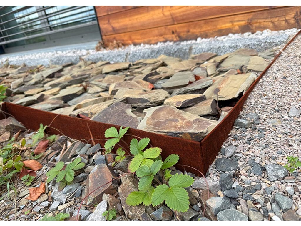 Obrubníky jsou vyrobeny z originální švédské oceli COR-TEN®, která je známá svou mimořádnou odolností vůči povětrnostním vlivům. Na povrchu se přirozeně vytváří charakteristická patina, která funguje jako ochranná vrstva proti korozi. Díky tomu jsou obrubníky zcela bezúdržbové, dlouhodobě stabilní a s časem získávají teplý, přírodní vzhled, který harmonicky zapadá do zahradního prostředí.